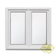 Plastové okno dvoukřídlé bez středového sloupku (se štulpem) o venkovním rozměru rámu okna 110x110 cm v bílé barvě z interiéru i z exteriéru. Hlavní křídlo (vpravo) je otevíravé i sklopné se stupňovaným výklopem. Vedlejší křídlo (vlevo) je otevíravé. Pravé značí, že hlavní křídlo je na pravé straně okna.