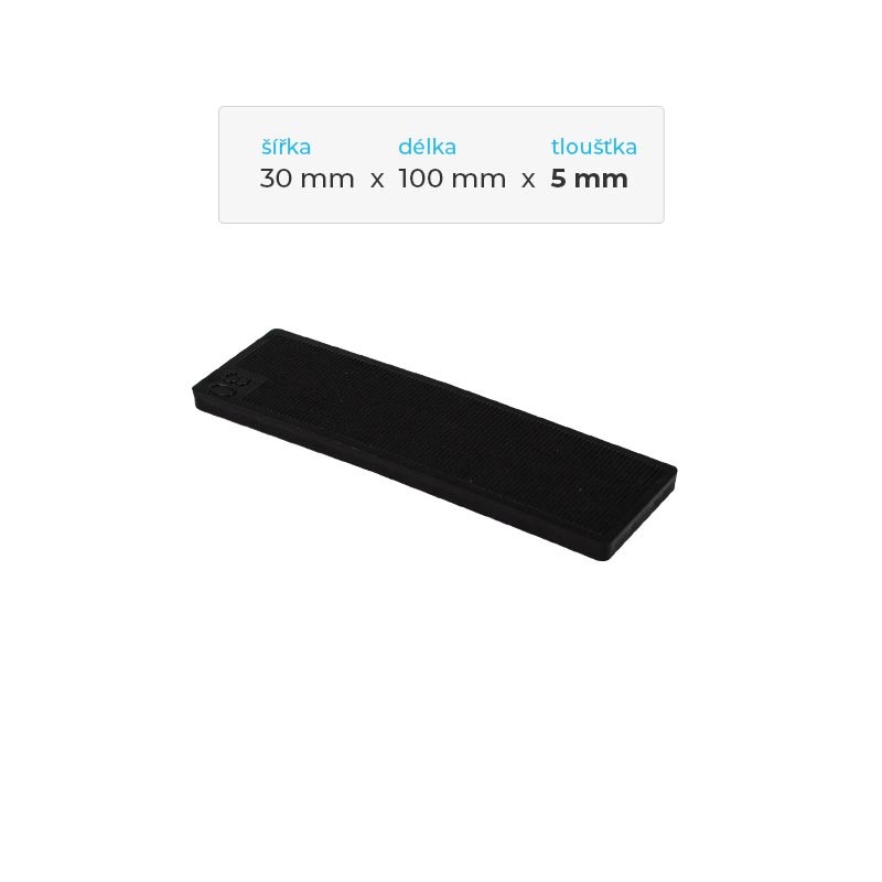Vymezovací (distanční) podložka o rozměrech 30 mm x 100 mm x 5 mm.